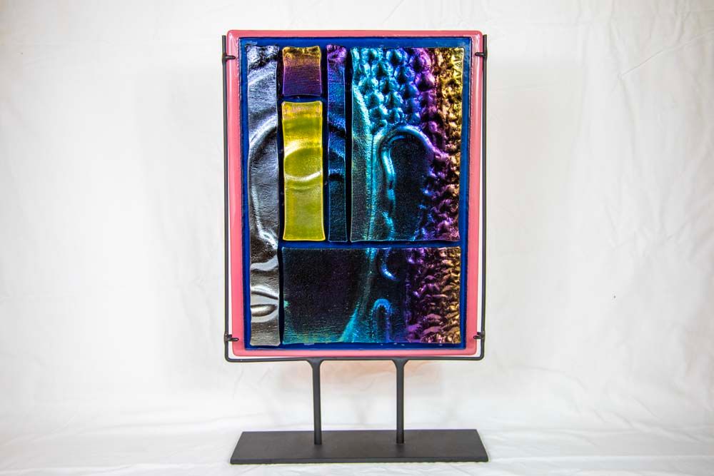 Patrice’s glass sculpture does not require back lighting but rather captures the ambient light of the room and reflects it back