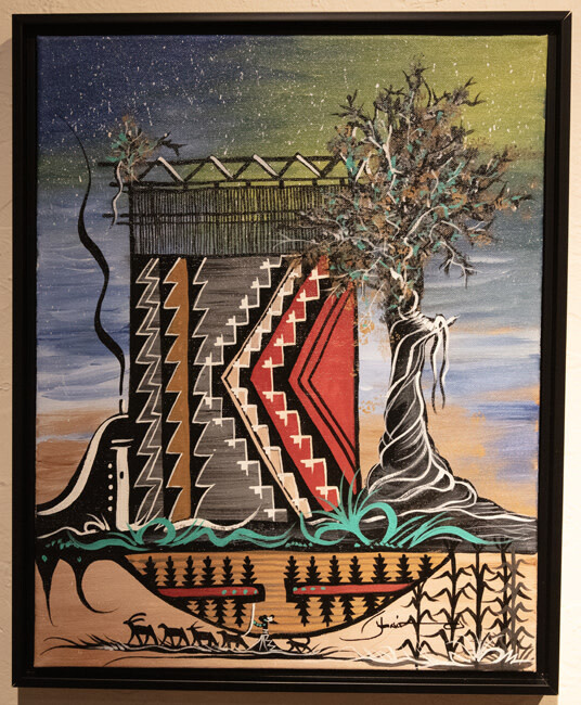 Janet Yanito is an older sister of Curtis Yanito and is very creative like her brother. She paints of her Native culture with bright acrylic colors and motifs. They all tell a story about their culture and the Navajo journey. Her pieces are all framed with a black wooden frame that makes her pieces stand out.
